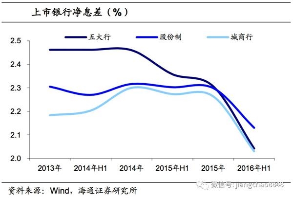 数据显示,14年以来,由于央行降准降息,五大行计息负债成本维持在1.7-2%,而股份行和城商行计息负债成本则从3.2-3.3%下行至2.2-2.3%左右。但是,由于资产端的贷款利率、债券收益率也在下行,且存款利率下行幅度低于资产端收益率导致上市银行的净息差明显缩窄。截至16年半年报,五大行净息差从14年的2.4-2.5%下行至2-2.1%,股份行和城商行则从14年的2.3%下行至2.1%左右。