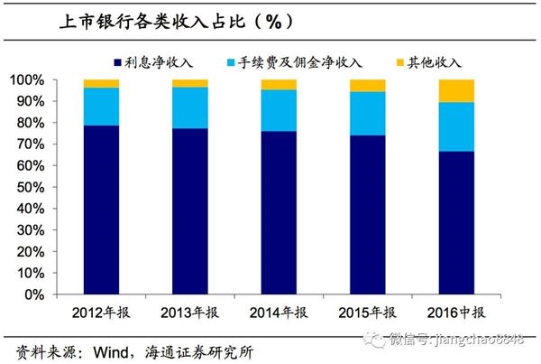 我们测算了上市银行营业收入中,利息净收入、手续及佣金费用和其他费用的占比。12年银行利息净收入占到营业收入的比重在78%左右,16年中报已下滑至66%;而手续及佣金费用的比重从12年的17%上上升至16年的23%。其他收入占比也从3.6%上升至10%左右。