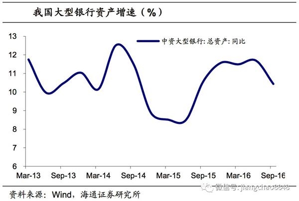 银行资产负债快速扩张。利率市场化推进的同时,银行业竞争加剧,过去稳定的存贷息差没有了政策保证,银行不得不做大规模,实行金融版的“薄利多销”模式。13年至16年,银行表内资产同比增速抬升,大型银行一般在10%-12%,而中小型银行的表内资产增速则高达16%-26%。