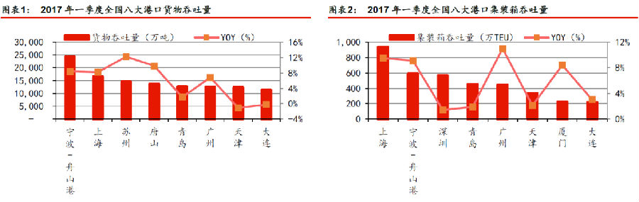 2017年一季度国内GDP增速6.9%,超过市场预期的6.8%和全年的6.5%的增长目标,创近六个季度新高。国内经济稳中向好的发展态势以及外贸对手国需求持续复苏,推动全国港口吞吐量的持续增长。