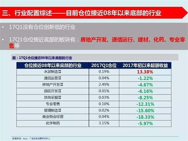 7、配置比例创历史新高和接近历史底部的行业——基金一季报配置比例创新高的板块有白电、基础建设、园林工程、稀有金属、医药商业、电子等;基金一季报配置比例接近底部的板块有房地产、通信运营、建材、化药、专业零售等。