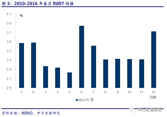 历史上流动性的季节性波动十分常见,主要表现为月末、季末和节假日前的短期资金面趋紧。以2010年至2016年为例,我们统计发现,每月下旬R007波动中枢较其他时间高约38个BP,而如果恰巧也是季末或者节假日前的话则高出更多,达到65个BP。从各月来看,春节当月以及各季度最后一个月资金价格中枢抬升较为明显,其中又以春节当月、6月和12月压力尤为巨大。