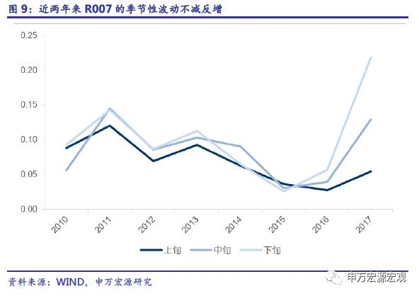 理论上而言,在监管的新常态下,商业银行月末季末“冲时点”的动机和能力应该大幅降低,流动性管理将更加稳健,短期资金面将更加平滑,然而实际情况并非如此。从年度对比来看,以波动性衡量的流动性季节性特征在2014年和2015年确实一度逐渐收窄,但自2016年以来再次出现扩大,2017年一季度已显著高于2011和2013年钱荒时的程度。