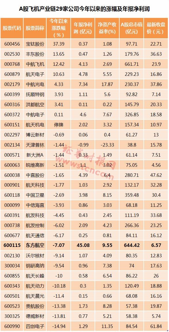 时报君梳理发现, A股共有29家上市公司涉及飞机产业链,其中28家年报盈利,东方航空以45.08亿排名首位。对于这份业绩,二级市场的投资者似乎并不买账。截至28日收盘,东方航空今年以来股价下跌了7.07%。