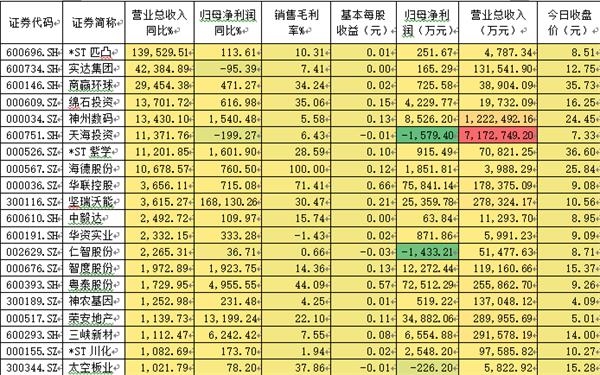 上表是营业收入同比增长幅度最大的20家公司,营业收入增长是公司盈利增长的基本条件,正常情况下,营业收入的增长都会带来利润的增长。当然,由于重组并购等因素也会出现营业收入增长大大快于净利润的情况。所以将二者对照着看,更能了解上市公司经营的真实情况。